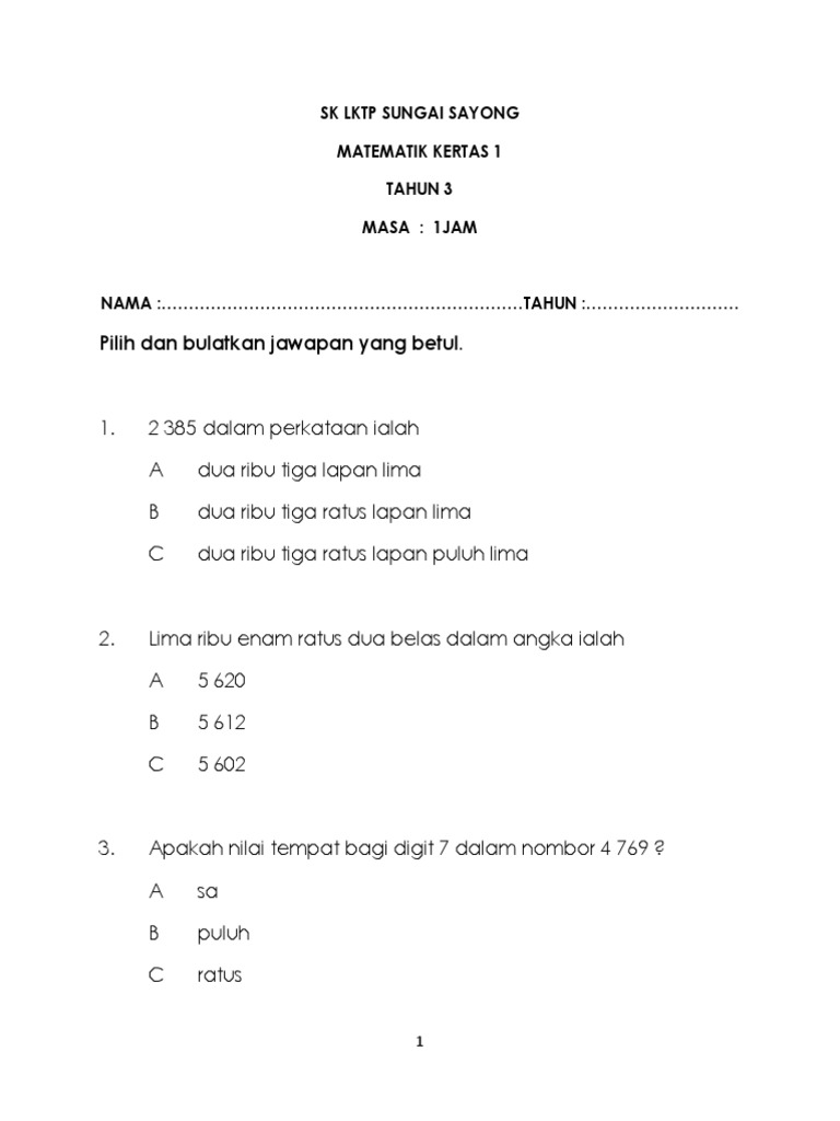 Soalan Matematik Tahun 3 Ujian 1 Bulan Mac 2017 Kertas 1 Pdf